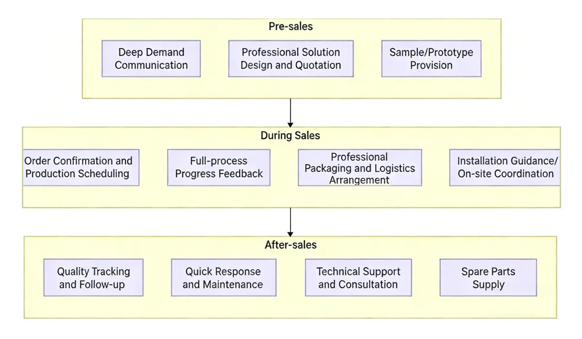 주문 확인 후 YeHaoXuan은 전용 생산 일정을 시작하여 진행 상황을 실시간으로 추적할 수 있습니다. 생산 후에는 전문적인 포장과 안정적인 물류를 활용하고, 원활한 제품 배송을 보장하기 위해 설치 지침과 필요한 현장 지원을 제공합니다.