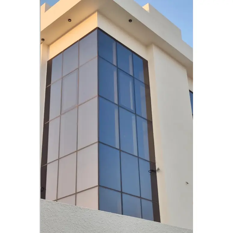 핵심 특징은 알루미늄 합금 프레임이 유리 내부에 숨겨지고 구조용 접착제로 고정되는 프레임리스 디자인입니다. 커튼월 표면에는 유리만 보이므로 파노라마 투명도라는 미니멀한 시각적 효과를 얻을 수 있습니다.